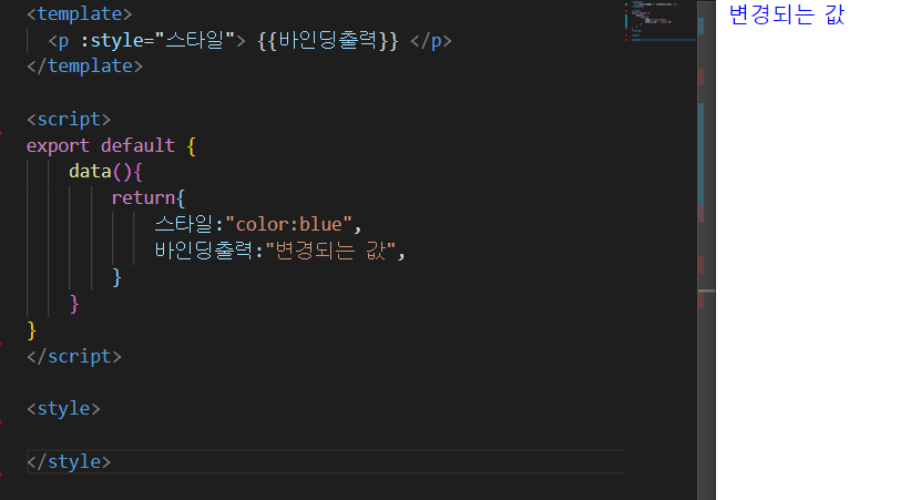 <p :style = "스타일"> {{ 바인딩출력 }} </p>